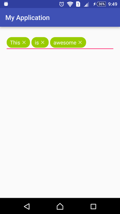 <mabbas007.tagsedittext.TagsEditText android:id="@+id/tagsEditText" android:layout_width="match_parent" android:layout_height="wrap_content" TagsEditText:allowSpaceInTag="true" TagsEditText:tagsCloseImageRight="@drawable/tag_close" TagsEditText:tagsBackground="@drawable/square" TagsEditText:tagsCloseImageLeft="@drawable/dot" TagsEditText:tagsTextColor="@color/blackOlive" TagsEditText:tagsTextSize="@dimen/defaultTagsTextSize" TagsEditText:tagsCloseImagePadding="@dimen/defaultTagsCloseImagePadding"/>