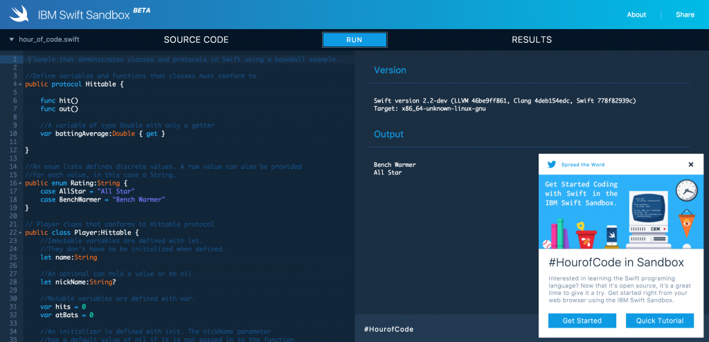 我们将使用一个棒球方面的示例来说明这些概念。但是,如果您不是忠实粉丝,不必担心!要开始使用,请访问IBM Swift Sandbox。Sandbox 提供了在云中编写 Swift 代码的一种快速简便的方法。在 Source Code 面板中编写代码,单击 Run,您会立刻在 Output 面板看到您的结果!