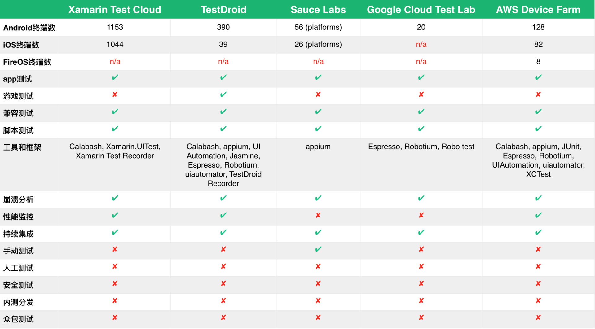 - 在测试设备的数量上,Xamarin Test Cloud和Sauce Labs都是非常有优势的,虽然Xamarin Test Cloud统计的是测试设备的数量,而Sauce Labs是平台的数量;