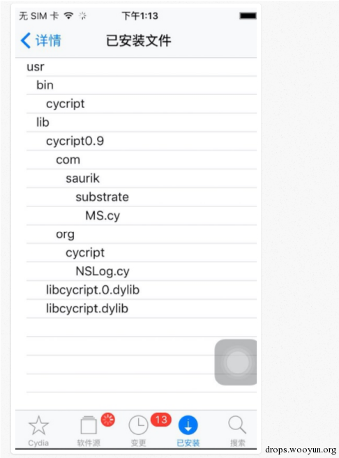在安装cycript过后,通过cydia可以看到安装cycript之后影响的目录结构