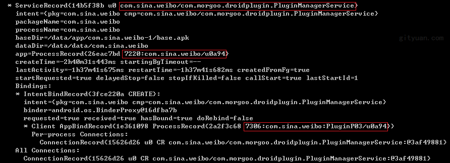 com.sina.weibo:PluginP03,uid=10094. - 该进程中还有Services,Connections, Providers, Receivers,可以看出该进程是没有Activity的进程。