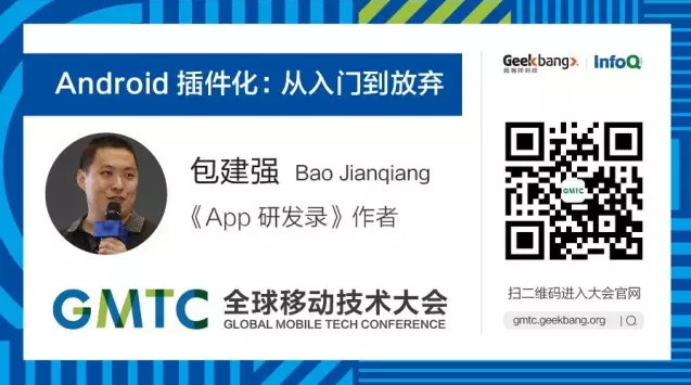 由InfoQ主办的 GMTC全球移动技术大会 将于6月24日在北京召开。本次大会我们邀请了《App研发录作者》包建强、插件化框架Small作者林光亮、DroidPlugin作者张勇,前来分享关于插件化的话题,我们还将邀请Lody全程参与我们的大会,与各位参会者交流。目前8折优惠期间,多人团购更多优惠,欲购从速!