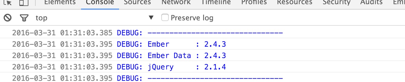 在开发阶段最好是把打开调试模式,开启之后可以在浏览器的控制台下看到ember项目执行过程的相关信息,有助于发现问题。