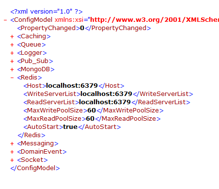 /// <summary> /// 配置信息实体 /// </summary> public class ConfigModel { public ConfigModel() { Caching = new Caching(); Queue = new Queue(); Logger = new Logger(); Pub_Sub = new Pub_Sub(); MongoDB = new MongoDB(); Redis = new Redis(); Messaging = new Messaging(); DomainEvent = new DomainEvent(); Socket = new Socket(); } /// <summary> /// 启用属性变化跟踪 /// </summary> [System.Xml.Serialization.XmlElementAttribute(Order = 0)] public int PropertyChanged { get; set; } /// <summary> /// 缓存相关配置 /// </summary> [System.Xml.Serialization.XmlElementAttribute(Order = 1)] public Caching Caching { get; set; } /// <summary> /// 队列相关配置 /// </summary> [System.Xml.Serialization.XmlElementAttribute(Order = 2)] public Queue Queue { get; set; } /// <summary> /// 日志相关 /// </summary> [System.Xml.Serialization.XmlElementAttribute(Order = 3)] public Logger Logger { get; set; } /// <summary> /// Pub_Sub相关 /// </summary> [System.Xml.Serialization.XmlElementAttribute(Order = 4)] public Pub_Sub Pub_Sub { get; set; } /// <summary> /// MongoDB相关 /// </summary> [System.Xml.Serialization.XmlElementAttribute(Order = 5)] public MongoDB MongoDB { get; set; } /// <summary> /// redis相关 /// </summary> [System.Xml.Serialization.XmlElementAttribute(Order = 6)] public Redis Redis { get; set; } /// <summary> /// Messaging消息相关 /// </summary> [System.Xml.Serialization.XmlElementAttribute(Order = 7)] public Messaging Messaging { get; set; } /// <summary> /// 领域事件相关 /// </summary> [System.Xml.Serialization.XmlElementAttribute(Order = 8)] public DomainEvent DomainEvent { get; set; } /// <summary> /// Socket通讯配置 /// </summary> [System.Xml.Serialization.XmlElementAttribute(Order = 10)] public Socket Socket { get; set; } } 对以上的设计完全是出于一种兴趣,感觉把每个模块都单独设置,在部署上不方便,所以把它们统一了,当然只适合于Lind.DDD框架,你自己的框架需要自己去定义实体了!