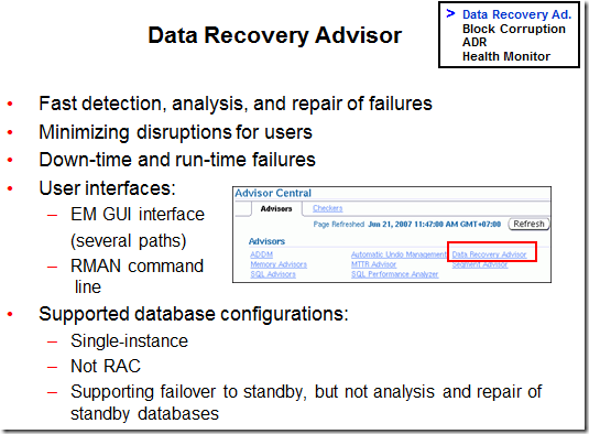 不能使用备库的块或者文件去修复主库的问题,也不能使用数据恢复顾问去诊断和修复备库的问题,但数据恢复顾问会把切换到备库作为一个修复选项。