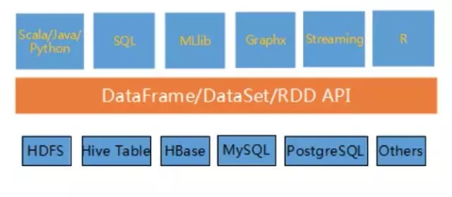 Spark 提供 SQL、机器学习库 MLlib、流计算 Streaming 和图计算 Graphx,同时也支持 Scala、Java、Python 和 R 语言开发的基于 API 的应用程序。