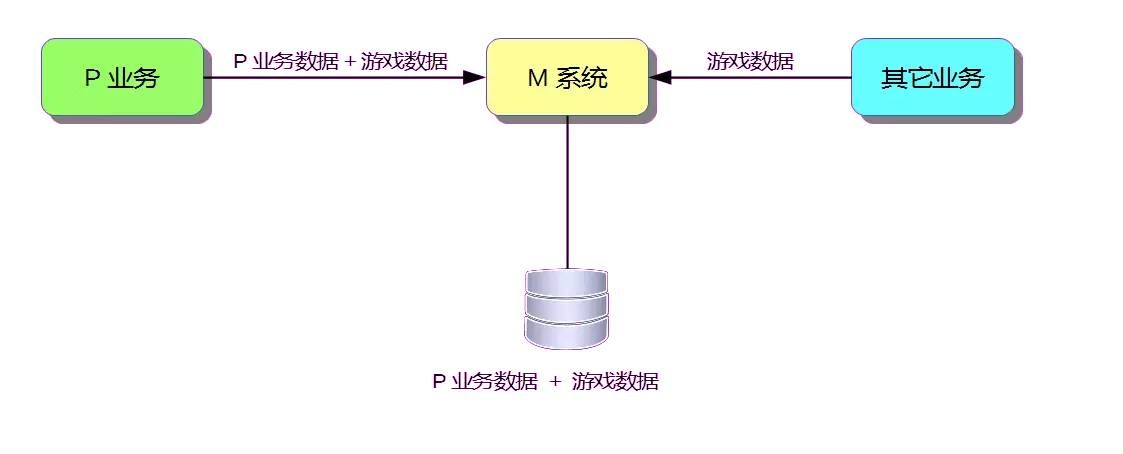 我接手的第一个系统是一个后台系统,负责管理整个阿里游戏的游戏相关的数据(以下简称M系统), 重构的主要原因是 因为系统耦合了P业务独有的数据和所有业务公用的数据,导致可扩展性比较差。其大概架构如下: