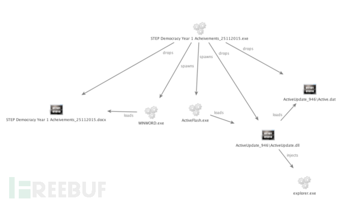 ASERT捕捉到的PIVY变种与以前发现的相比出现了一些新的行为。样本会释放一个doc诱饵-通常在目标上会有清晰地提示,一个名为ActiveUpdate.dll的DLL和PIVY shellcode文件Active.dat。ActiveUpdate.dll和Active.dat文件在形如ActiveUpdate_ [0-9]{3}的文件夹中创建。可执行文件把rundll32.exe拷贝为ActiveFlash.exe,然后用这个新文件执行DLL,通过在Window启动目录下创建.Lnk文件实现自启动安装。ESET把这些样本称为“Win32/Korplug.I[F-I] variant”,或许是因为恶意软件通过rundll32使用DLL旁加载技术加载释放的DLL来执行它的恶意行为。这个恶意软件从去年(或许更早)就开始部署了,在拷贝rundll32时使用了不同的可执行文件名和目录名,但是,这篇文章只讨论使用“ActiveUpdate”的变种子集。