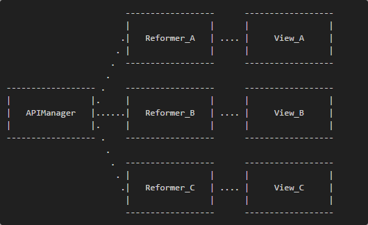 APIManager提供了来自网络层的数据。Reformer_A,Reformer_B,Reformer_C,分别代表不同的领域。View_A,View_B,View_C,分别就是各领域对不同的数据应用之后产生的结果。在讲 网络层的文章 中,我设计了reformer的方式来实现非对象化。更详细的讲述和实际的Demo文章里都有,我在这里就不多说了。