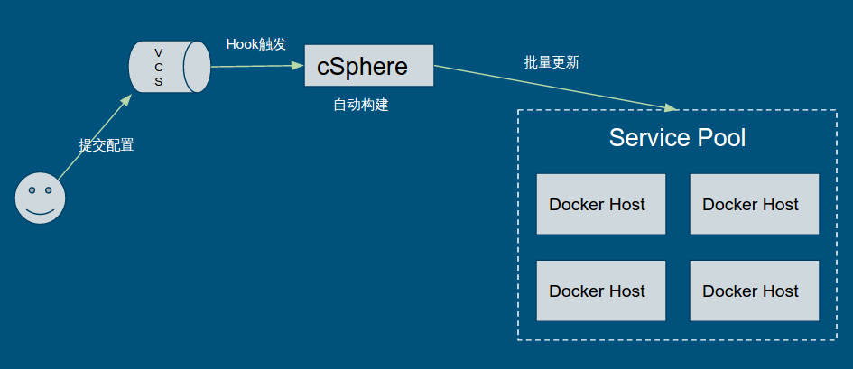 基于这一思路,我们在cSphere中添加了个镜像自动构建模块,用户可以配置代码仓库的地址。服务的配置文件保存于git或者SVN库中,需要配置变更时,向版本库中push一下,自动通过hook触发镜像构建,并自动完成线上容器的重建。