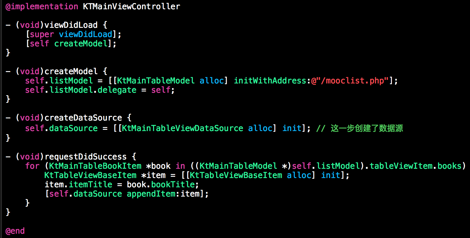 - (void)viewDidLoad { [super viewDidLoad]; [self createModel]; // Do any additional setup after loading the view, typically from a nib. } - (void)createModel { self.listModel = [[KtMainTableModel alloc] initWithAddress:@"/mooclist.php"]; self.listModel.delegate = self; } - (void)createDataSource { self.dataSource = [[KtMainTableViewDataSource alloc] init]; // 这一步创建了数据源 } - (void)didReceiveMemoryWarning { [super didReceiveMemoryWarning]; // Dispose of any resources that can be recreated. } - (void)requestDidSuccess { for (KtMainTableBookItem *book in ((KtMainTableModel *)self.listModel).tableViewItem.books) { KtTableViewBaseItem *item = [[KtTableViewBaseItem alloc] init]; item.itemTitle = book.bookTitle; [self.dataSource appendItem:item]; } } 其他的判断,比如请求结束时关闭动画,最后一页提示没有更多数据,下拉刷新和上拉加载触发的方法等公共逻辑已经被父类实现了。
