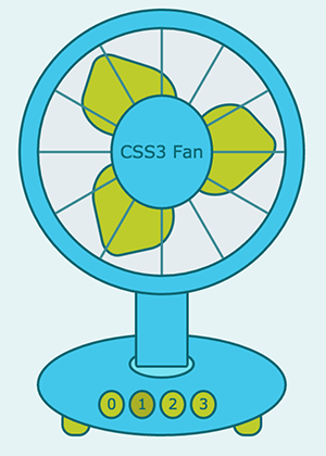 .switch{ position: absolute; width: 24px; height: 24px; top: 296px; z-index: 13; opacity: 0; cursor: pointer; } .switch_0{ .switch; left: 50px; &:checked+div{ &+input+div+input+div+input+div+.mask{ .leafs{ animation-play-state:paused; } } } } .switch_1{ .switch; left: 75px; &:checked+div{ background: #a9af27; color: #0e6873; &+input+div+input+div+.mask{ .leafs{ animation-duration : 0.7s } } } } .switch_2{ .switch; left: 100px; &:checked+div{ background: #a9af27; color: #0e6873; &+input+div+.mask{ .leafs{ animation-duration : 0.4s } } } } .switch_3{ .switch; left: 125px; &:checked+div{ background: #a9af27; color: #0e6873; &+.mask{ .leafs{ animation-duration : 0.3s } } } } 至于电扇的CSS样式部分就不再赘述了。