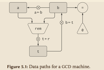 寄存器机器包含 数据通路(寄存器和操作) 和确定操作顺序的 控制器 。书中以 gcd 算法为例介绍: