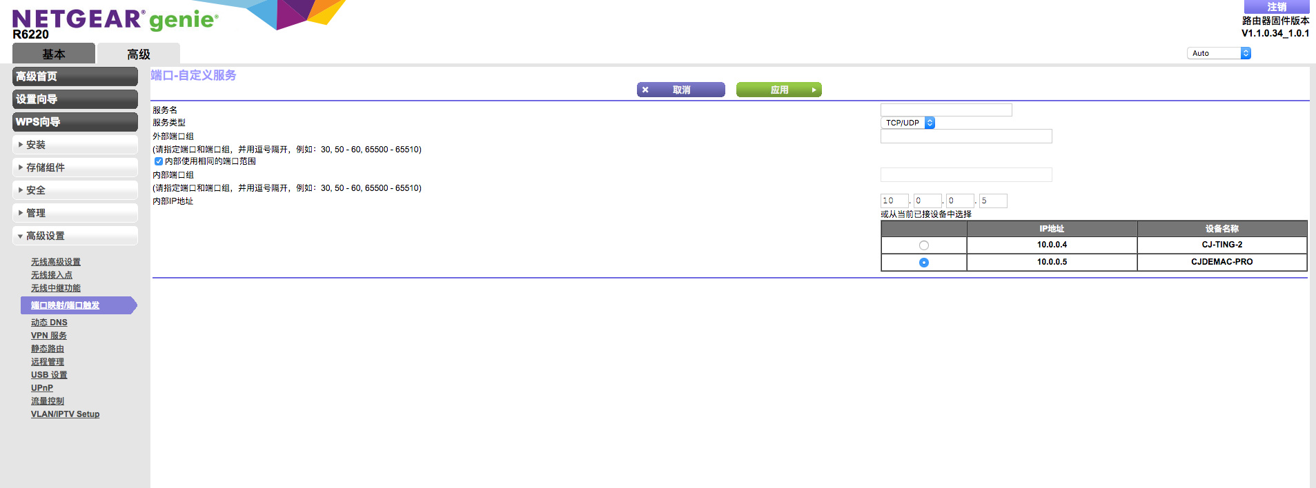 首先,我们可以手动添加NAT表项。大部分路由器里面都有这个设置项。我的NETGEAR路由器的设置页面如图所示。