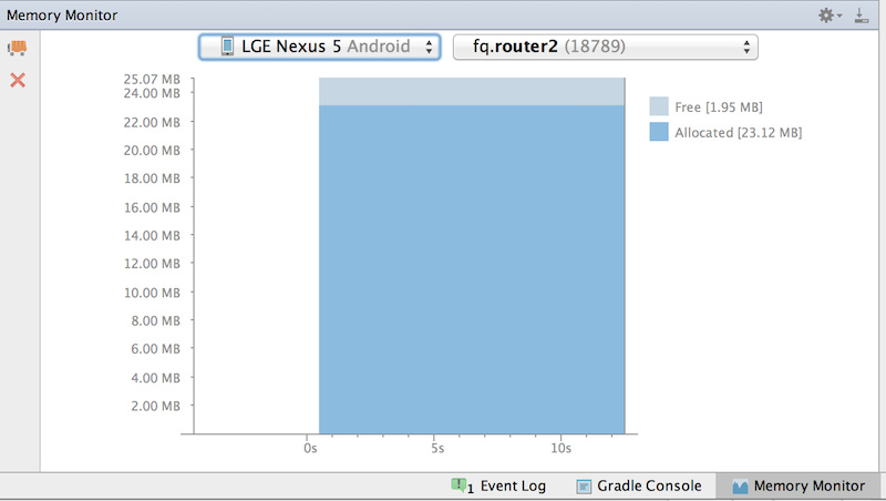 Android Studio自带的Memory Monitor,很简单的一个小工具,能够把应用内存实时展现出来,简单到我认为不需要多说了。如下图: