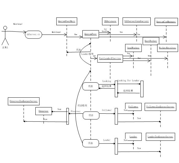 ZooKeeper 的启动由 zkServer.sh 发起,真正的起源是 Java 类 QuorumPeerMain,然后进行了一系列配置后启动负责 ZooKeeper 服务的线程,具体调用过程如图 1 所示,我会在后续的操作过程中逐一解释。