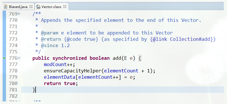 package jvmProject; import java.util.List; import java.util.Vector; public class Biased { public static List<Integer> numberList = new Vector<Integer>(); public static void main(String[] args) { long begin = System.currentTimeMillis(); int count = 0; int startnum = 0; while(count<10000000){ numberList.add(startnum); startnum+=2; count++; } long end = System.currentTimeMillis(); System.out.println(end-begin); } } 初始化一个Vector,往里面添加10000000个Integer对象,然后输出时间差。以此来测试偏向锁的性能。至于为什么要使用Vector而不使用ArrayList呢?