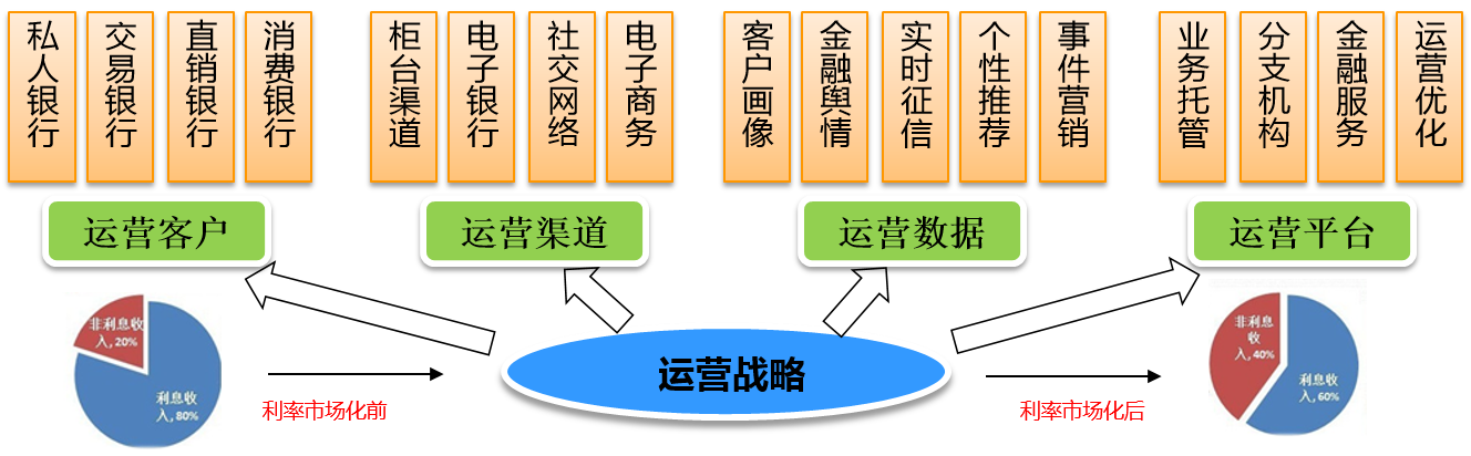 银行业已经告别了传统的以银行业务为中心的业务模式,开始转变成以客户需求为核心进行业务设计与金融创新,这也正是场景金融的内涵。无论是传统的电子银行业务,还是渠道创新的直销银行业务,以及互联网金融的各种宝们,都是满足客户各种场景金融需求而建立的金融业务。下图是现代银行的一些业务及其基于的运营平台。