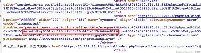 public function showFlash($uid, $appId, $appKey, $getHtml = 1) { $time = Pw::getTime(); $key = WindidUtility::appKey($appId, $time, $appKey, array('uid'=>$uid, 'type'=>'flash', 'm'=>'api', 'a'=>'doAvatar', 'c'=>'avatar'), array('uid'=>'undefined')); $key2 = WindidUtility::appKey($appId, $time, $appKey, array('uid'=>$uid, 'type'=>'normal', 'm'=>'api', 'a'=>'doAvatar', 'c'=>'avatar'), array()); $postUrl = "postAction=ra_postAction&redirectURL=/&requestURL=" . urlencode(Wekit::app('windid')->url->base . "/index.php?m=api&c=avatar&a=doAvatar&uid=" . $uid . '&windidkey=' . $key . '&time=' . $time . '&clientid=' . $appId . '&type=flash') . '&avatar=' . urlencode($this->getAvatar($uid, 'big') . '?r=' . rand(1,99999)); ... } 这里调用了WindidUtility::appKey生成key,并将这个key放入了url中。其实这个功能是前台用户头像上传,我们来到 http://10.211.55.3/phpwind/index.php?m=profile&c=avatar&_left=avatar 右键源码即可查看到当前的key: