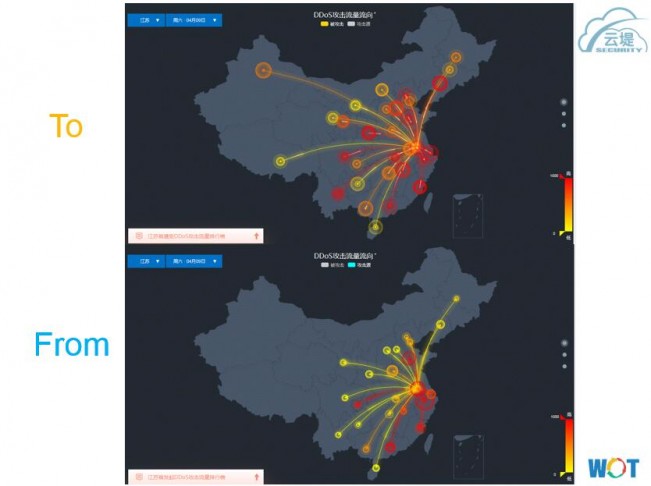 这也是4月9日当天24小时的图。左图,我们可以看到没一个省遭受的攻击,颜色表示严重程度,颜色越深越红表示遭受的攻击越多。右图表示从这些省有多少流量打出来,颜色越红表示从这个省发出的DDoS攻击流量越多。从图中,我们可以看出,遭受攻击最多的是东南沿海,以及北京、辽宁等地经济比较发达的省。因为这些省有很多IDC的资源,他的互联网接近国际出口和一些互联互通的出口。但是比较有意思的是发起攻击的这些地方,其实你会看到一些非常非常生僻的省,它的颜色大家觉得它在互联网经济上不是很繁荣的一些省,比如像甘肃、新疆的颜色也很深,所以这张图对比起来,就会感觉到其实我们要面对的这些攻击发起点,真的是非常非常的分散的。