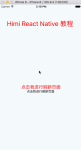 importReact, { AppRegistry, Component, StyleSheet, View, Text, TouchableHighlight, } from 'react-native'; importMyTextfrom './MyText' class AwesomeProject extends Component { constructor(props) { super(props); this.state = { refreshName :'点击我进行刷新页面', }; } testEvent(){ this.setState({refreshName:'Himi'}); } render() { return ( <Viewstyle={styles.himiViewStyle} > <Text style={styles.himiTextStyle}>HimiReactNative 教程 </Text> <Viewstyle={styles.himiViewStyle}> <TouchableHighlight underlayColor='#4169e1' onPress={this.testEvent.bind(this)} > <Text style={styles.text} > {this.state.refreshName} </Text> </TouchableHighlight> <MyText myTextContent={this.state.refreshName} /> </View> </View> ) } }; var styles = StyleSheet.create({ text: { color:'#f00', fontSize:20, }, himiViewStyle:{ flex: 1, flexDirection: 'column', justifyContent: 'center', alignItems: 'center', backgroundColor: '#F5FCFF', }, himiTextStyle:{ color:'#f00', fontSize:30, marginTop:70, }, }); AppRegistry.registerComponent('AwesomeProject', () => AwesomeProject); 以上主要做了如下功能: