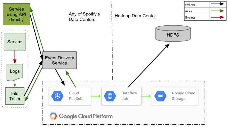 Spotify运行的大部分数据任务都是批量作业,它们要求事件可以可靠的导入持久化存储中。一般对于持久化存储来说,大家常用的是Hadoop分布式文件系统(HDFS)和Hive。为了解决Spotify数据存储量和工程师的日益增长,使用 Google云存储 替代HDFS,使用 Google的BigQuery 代替Hive。