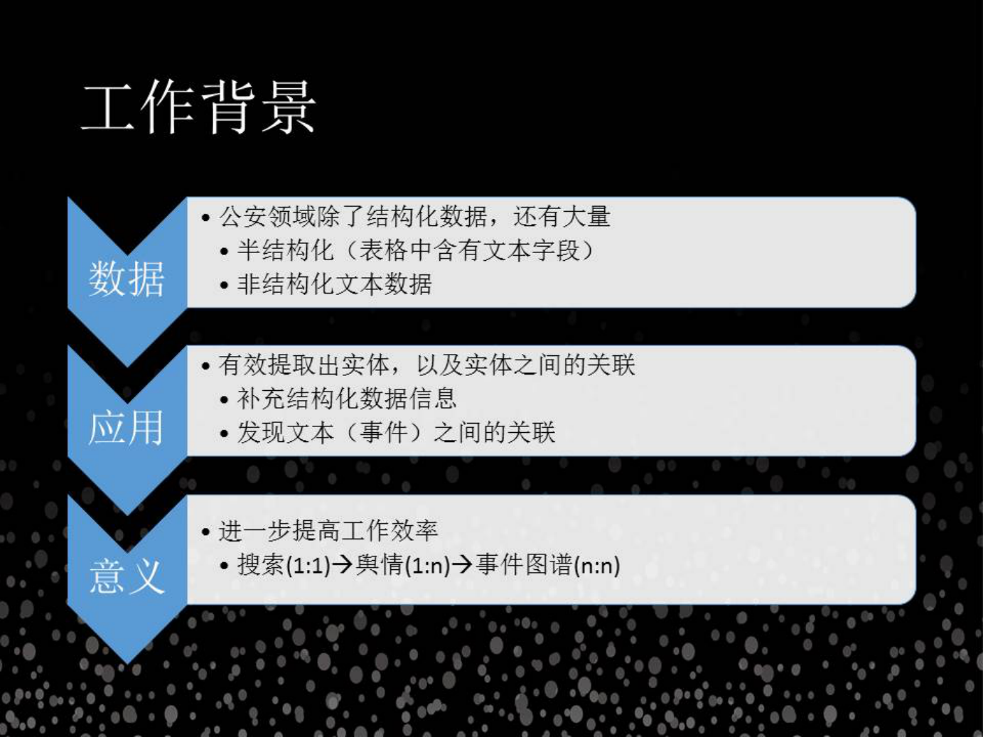 从特定类型文本中提取实体关系。这些领域除了有很多结构化数据之外,还有跟多的文本数据,通俗意义上都叫做非结构化数据(这里不包括语音、图片、视频等)。在应用里面,结构化描述的数据是非常清楚的,对于文本来说,由于大家书写的形式各异,表达方式多样,这个里面提到的很多要素,如人名、车牌号、手机号、组织名等都是称之为实体。实体和实体的关系,以及实体和事件的关系,是比较难发现之间的关联,说明了前两点之后再看第三点,意义在哪里?其实随着文本数据,文本数据的信息被大规模的被发挥出来,最早来自于互联网公司,比如说百度、Google以及基于此创造很大的价值,随着互联网公司的兴起,大家对非结构化数字文化挖掘越来越重视。