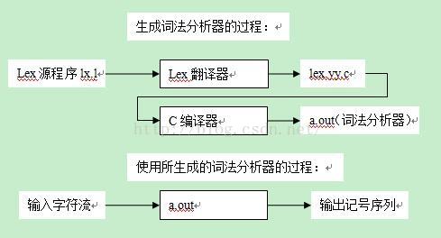 Lex的基本工作原理为:由正规式生成NFA,将NFA变换成DFA,DFA经化简后,模拟生成词法分析器。