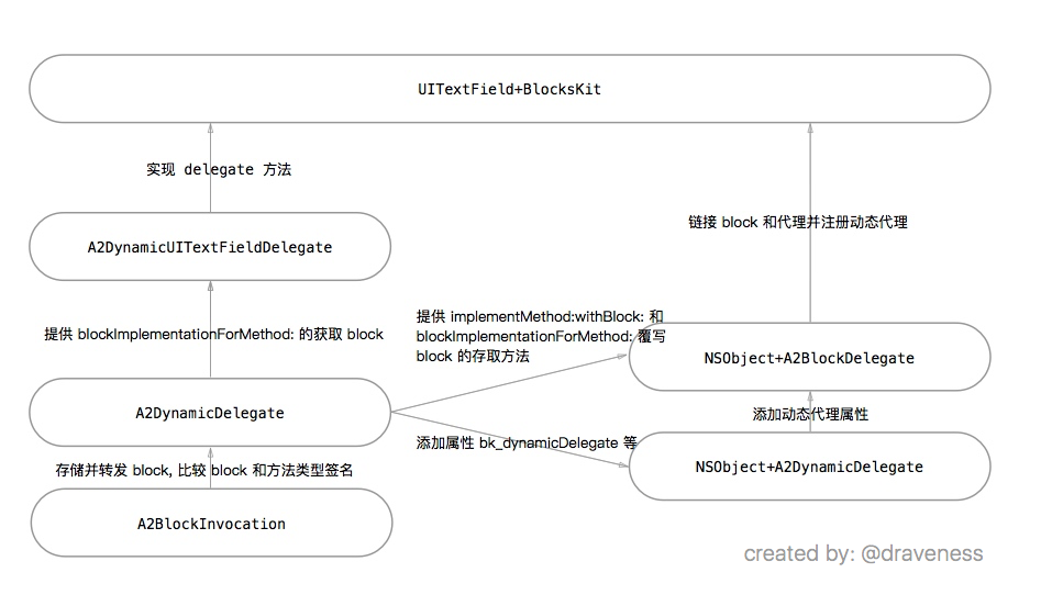 A2BlockInvocation的主要作用是存储和转发 blockA2DynamicDelegate用来实现类的代理和数据源,它是NSProxy的子类NSObject+A2DynamicDelegate负责为返回bk_dynamicDelegate和bk_dynamicDataSource等A2DynamicDelegate类型的实例,为NSObject提供主要的接口NSObject+A2BlockDelegate提供了一系列接口将代理方法映射到 block 上- 其他的 UIKit 的分类提供对应的属性,并在对应的