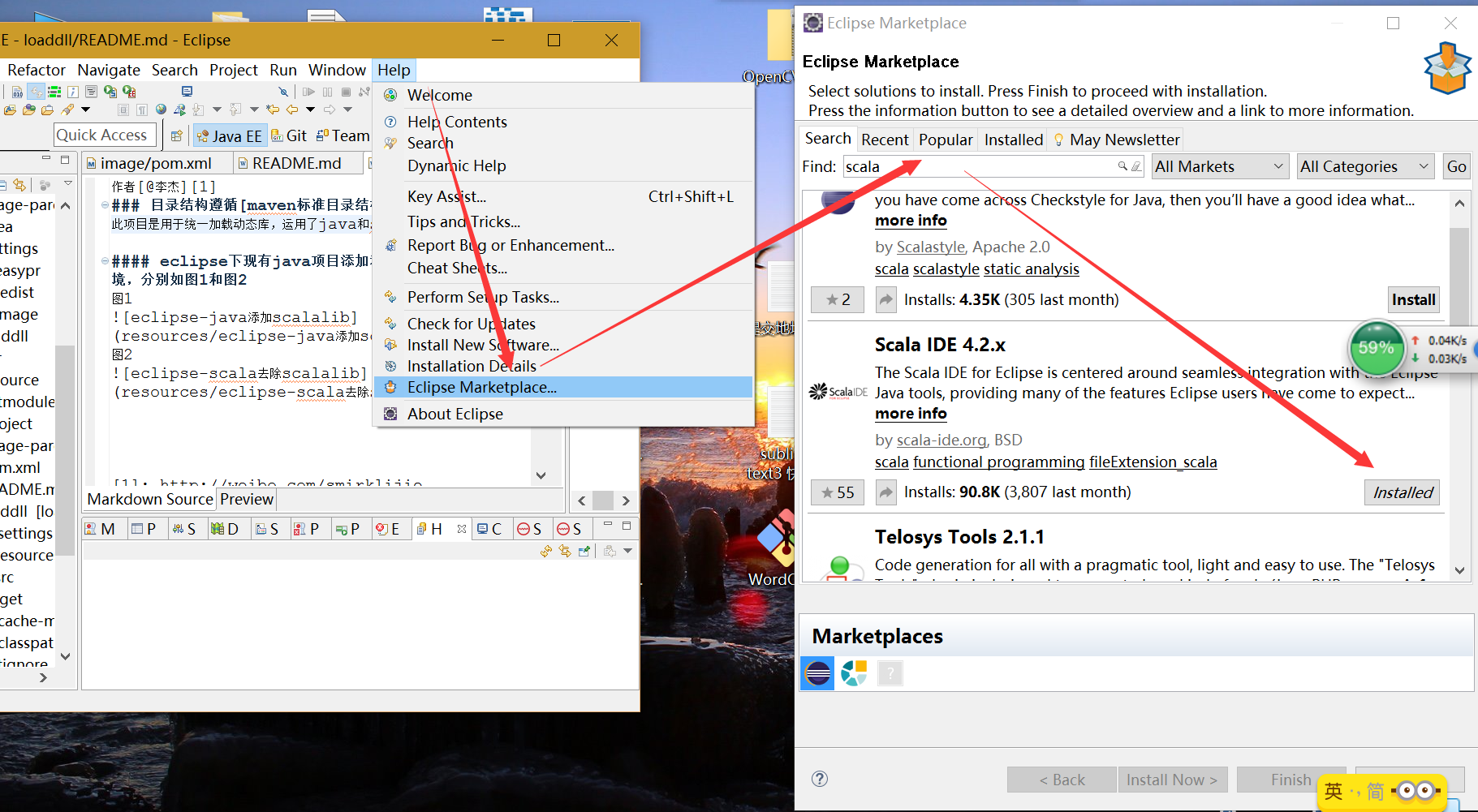 eclipse(Mars-4.5.1版示例)添加scala插件,以及对现有java项目添加和去除scala编译环境,如下面图示