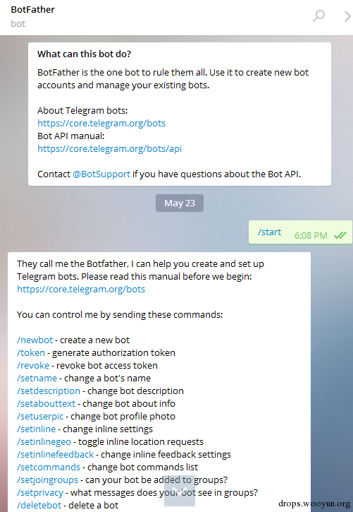 在Github上,涉及到将社交网络作为C2 server(可理解为命令控制服务器)的poc项目越来越多,如利用gmail的 gcat 、 gdog ,利用twitter的 twittor 、以及利用Telegram的 Blaze Telegram Backdoor Toolkit (bt2) ,使用这类方法的好处不仅仅是因为社交网络的服务器稳定,更多的原因在于其通信可以隐藏在正常流量中,不易被发现。本文将对Telegram中的Bots功能作详细介绍,并通过python实现基础的的api调用,同时对Blaze Telegram Backdoor Toolkit (bt2)进行测试,分享其中需要注意的地方。