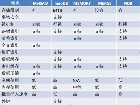 目前MySQL支持的存储引擎有MyASAM、InnoDB、MEMORY、MRG_MyASM等等,需要根据实际业务情况来选择存储引擎,具体比较如下表: