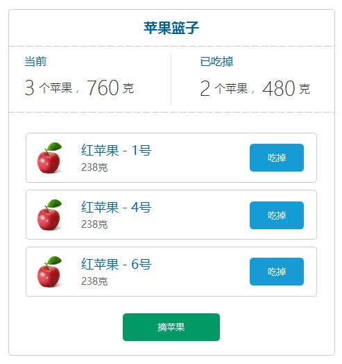 .appleBusket{ width: 400px; margin: 20px; border-radius: 4px; border: 1px solid #ddd; >.title{ padding: 6px 0px; text-align: center; color: #069; font-size: 20px; //font-weight: 600; } >.stats{ width: 100%; $border: 1px dashed #ddd; border-top: $border; border-bottom: $border; padding: 10px 0px; .section{ display: inline-block; width: 50%; padding-left: 8px; .head{ padding: 6px 0px; font-size: 16px; color: #069; } .content{ font-size: 20px; font-weight: 200; } &:first-of-type{ border-right: 1px solid #f0f0f0; } } } >.appleList{ padding: 10px 0px; .empty-tip{ text-align: center; font-size: 16px; color: #ccc; padding: 20px 0px; } } >.btn-div{ text-align: center; button{ color: #fff; background-color: #096; border: none; font-size: 14px; padding: 6px 40px; border-radius: 6px; margin: 20px auto; } } } 苹果组件的样子如下: