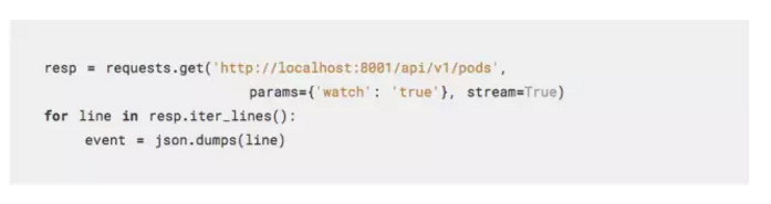 当使用分块编码流传输的时候,Kubernetes master会通过发送分块的尺寸开始传输分块。但是它不会发送一整个分块,它只会发送一行文本,再被一行新的文本终止。这行文本是JSON编码对象,里面还有event以及修改过的resource项目。所以协议是基于行的,而分块编码只是当结果可得的时候一个用来分流这些结果的方法。从表面上看用请求来做这个似乎不那么难:
