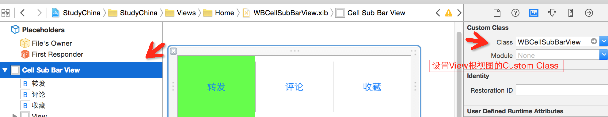 WBCellSubBarView *cellBar = [[[NSBundle mainBundle] loadNibNamed:@"WBCellSubBarView" owner:self options:nil] lastObject]; cellBar.frame = CGRectMake(0, 0, kScreenBoundWidth, height); 提示: