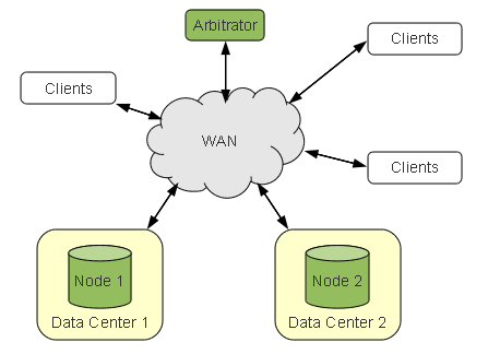 如果一个数据中心失败或者是断开连接,并且它与 Galera Arbitrator 是接连的话,那 Galera Arbitrator 就会作为中间件的扩展。例如 node1 与 node2 是断开连接的,此时若 node1 与 Galera Arbitrator 、 node2 与 Galera Arbitrator 连接的话,那 Galera Arbitrator 作为中间件将会为 node1 与 node2 连接通信。