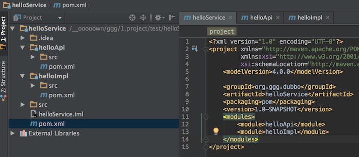 接下来新建一个Maven工程helloService,再给它添加两个Module,分别为helloApi(接口和模型,被消费者所依赖)和helloImpl(实现,依赖helloApi)。GroupId随意设置便可,我填的是 org.ggg.dubbo 。工程创建好了应该是这样的: