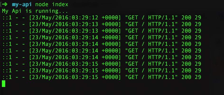 var express = require('express'); var cors = require('cors'); var morgan = require('morgan'); var app = express(); app.use(morgan('common')); app.use(cors({ origin: ['http://localhost:3001'], methods: ['GET', 'POST'], alloweHeaders: ['Conten-Type', 'Authorization'] })); app.get('/', function(req, res) { res.json({status: 'My Api is alive!'}); }); app.listen(3000, function() { console.log('3000 My Api is running...'); }); app.listen(3001, function() { console.log('3001 My Api is running...'); }); module.exports = app; 重启服务器,多次访问 localhost:3000 , 验证是否生成日志。