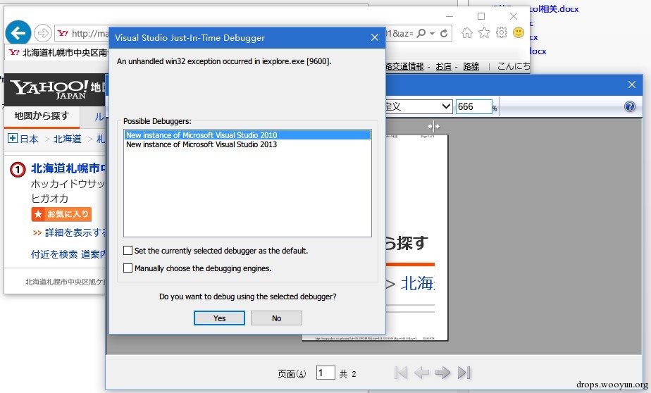接下来,让我们复现崩溃吧。打开map.yahoo.co.jp,访问出现崩溃的代码,右键预览。只不过这次我们使用缓存文件的方式来精简代码。预览后,从%TEMP%下复制走所有新生成的HTM文件,然后调节打印预览的比例为666%。在确定仍然可以崩溃之后,让我们开始删除无用数据,记下异常偏移e9b102(在我的机器上是这个数字,因为有些崩溃在精简代码时可能变成其他的崩溃,所以最好记下偏移地址,以免中途不知道从什么位置产生了新问题)。多次精简之后,我们留下了下列代码: