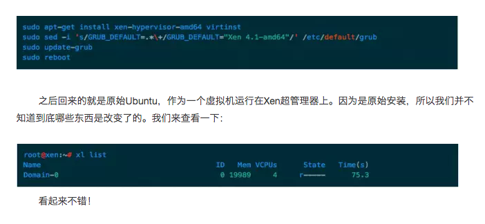 在一个新的Ubuntu16.04上面,安装Xen,libvirt和virtinst。将它作为默认引导点,并且重新启动。virtinst