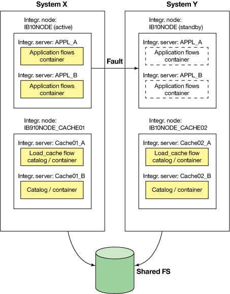 集成节点 IB10NODE_CACHE01 包含两个集成服务器( Cache01_A 和 Cache02_B ),各有一个目录服务器,所以当这个集成节点运行的时候,缓存是可用的。集成服务器 Cache01_A 运行应用程序 Load_Cache ,从数据库加载缓存。系统 Y 上的集成节点 IB10NODE_CACHE02 使用两个集成服务器(C ache02_A 和 Cache02_B )来确保缓存的高可靠性,每一个集成服务器有一个目录服务器。如果系统 X 或集成节点 IB10NODE_CACHE01 不可用,那么缓存由节点 IB10NODE_CACHE02 管理。