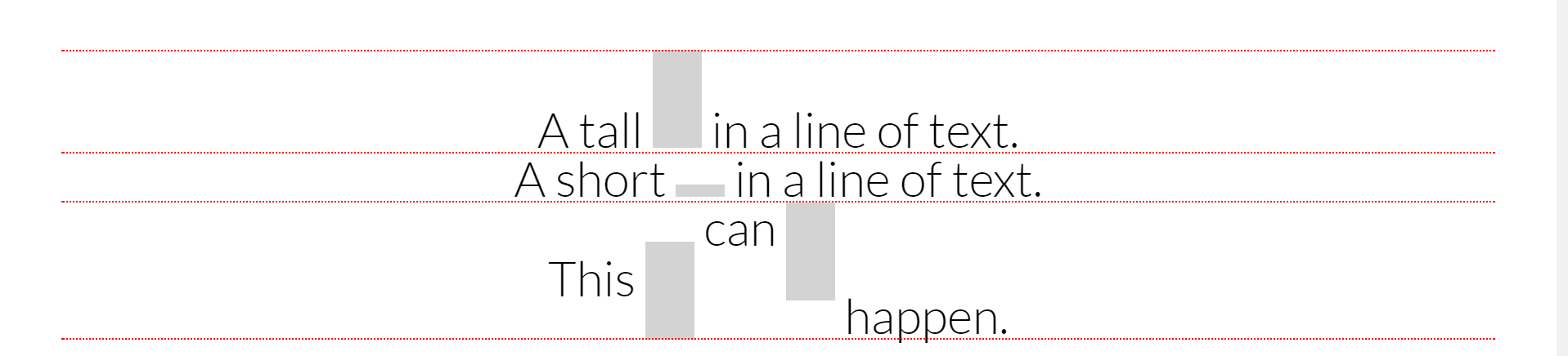 inline元素逐个从左到右地被放置在一行内。一旦有更多的元素加入,使当前行无法放下,一个新的行就会在下方产生。所有这些行有所谓的 line box ,其中包含所有的内容。不同尺寸的内容意味着不同高度的line box。在下图中,line box的顶部和底部是红色线表示的: