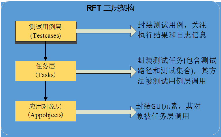 应用对象层:该层包含了以被测程序用户界面元素逻辑关系组织的类。这些类又基于每个更基础的类,比如按钮和文本框。这些类将 RFT 的测试对象完全封装起来,并使它们能被上层代码重用。