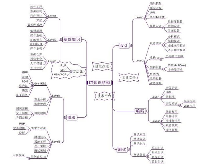 在导图出来后接着对IT人员的技能发展重新进行梳理,即不同级别的人员他们应该掌握的知识体系究竟是如何的?哪些是理论的基础知识,哪些是应用知识,又包括了哪些技能需要掌握。该技能发展路径后续被应用到了我们的岗位职业技能发展规划里面,起到一定的作用。