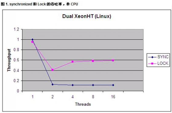 图 1 和图 2 中的图表以每秒调用数为单位显示了吞吐率,把不同的实现调整到 1 线程 synchronized 的情况。每个实现都相对迅速地集中在某个稳定状态的吞吐率上,该状态通常要求处理器得到充分利用,把大多数的处理器时间都花在处理实际工作(计算机随机数)上,只有小部分时间花在了线程调度开支上。您会注意到,synchronized 版本在处理任何类型的争用时,表现都相当差,而 Lock 版本在调度的开支上花的时间相当少,从而为更高的吞吐率留下空间,实现了更有效的 CPU 利用。