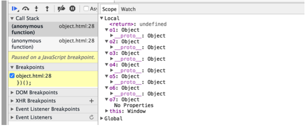 var o1 = {};//字面量的表现形式 var o2 = new Object; var o3 = new Object(); var o4 = new Object(null); var o5 = new Object(undefined); var o6 = Object.create(Object.prototype);//等价于 var o = {};//即以 Object.prototype 对象为一个原型模板,新建一个以这个原型模板为原型的对象 //区别 var o7 = Object.create(null);//创建一个原型为 null 的对象 在 chrome 里查看各个新建对象的区别: