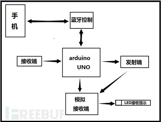 框图说明: 接收端接收信号,由arduino单片机解码,并将解码信息通过蓝牙发送到手机,在手机蓝牙串口监视器显示(解码过程);手机发送24位遥控码到单片机,单片机将24位遥控码通过发射端发出,用于遥控模拟接收端通过接收端PT2272芯片解码后在LED信号灯得到反馈,模拟接收端由单片机直接供电,发射端发出的信号也可直接有其他遥控接收端接收达到其他目的。