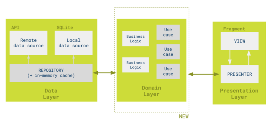 分析了每层之后,我们发现,依赖的关系是 PresentationLayer --> DomainLayer --> DataLayer 的。 DomainLayer --> DataLayer 不知道有android平台的存在。 因此,只要我们围绕这个原则去做架构,那么就称的上是Android-CleanArchitecture。
