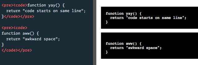 <pre><code> function cool(x) { return x + 1; } </code></pre> 解释一下:在 <pre><code> 和代码之间有一个换行,而这也会被显示成一个空行,这非常讨厌。没有非常好的 CSS 方法来解决这个问题,最好的方法是与 <pre> 标签同一行开始代码,或者用编译程序来去除这里的换行。