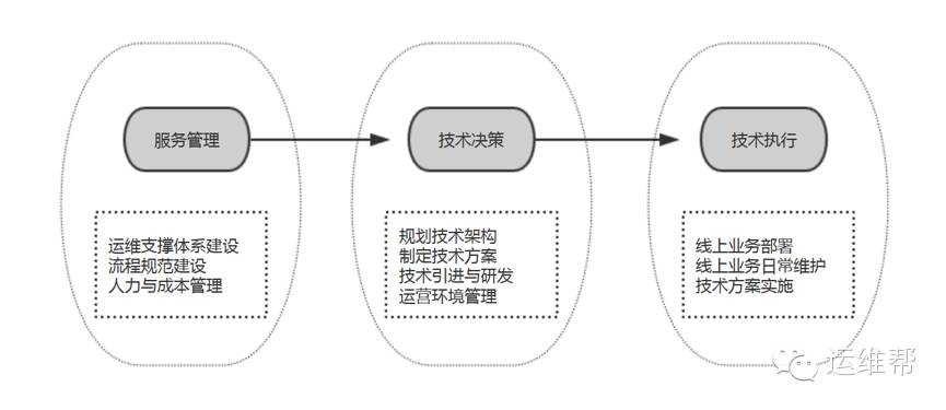 服务管理层面主要是从运维总体支撑的角度来管理运维质量、规范、成本等等,处在运维工作的最高层;技术决策主要是为实现管理目标去制定总体方案,实施路径;技术执行则是落地的最后一环,这一环工作往往呈现零散、杂乱、重复、频繁变更的特点,承接的需求量最多,但价值体现却是较低的一环。